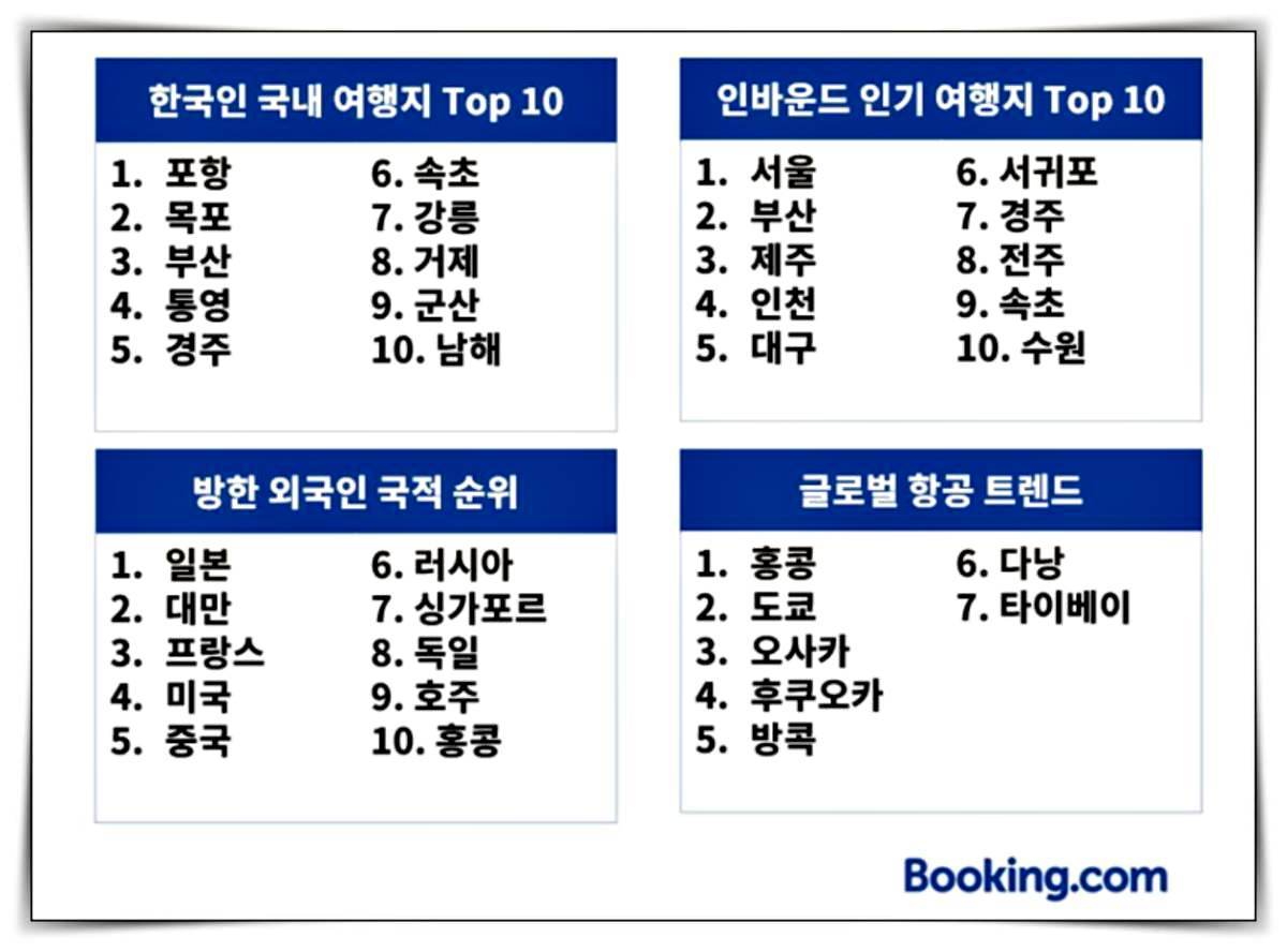 今回の分析は、5月のゴールデンウィーク期間(4月30日~5月6日)の宿泊チェックインデータに基づいて行われた。韓国人の国内旅行先検索数増加率上位には、ポハンをはじめ、木浦、統営、巨済、群山、南海などの都市が名を連ねた。海沿いの小都市が注目される中、開放的な海の景色と静かな地域特有の雰囲気を求める需要が顕著に増加していると見られる。