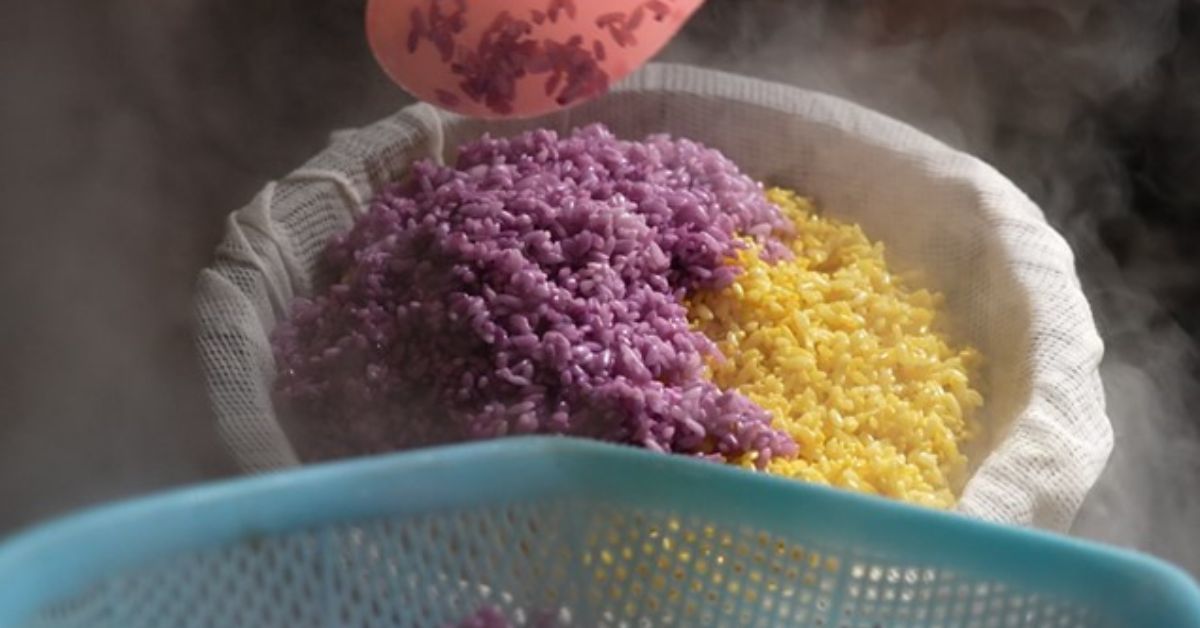 惜別の寂しさと再会の喜びを胸に、次はルオピンの名物を味わいに向かう。プイ族の伝統料理、五色花飯だ。さまざまな花や葉など、自然素材で彩られた五色花飯は、まるで食卓に春を呼び込むかのよう。色とりどりの自然の恵みが詰まった五色花飯に菜の花炒めを添え、口いっぱいに春の味と自然のエネルギーを感じる。