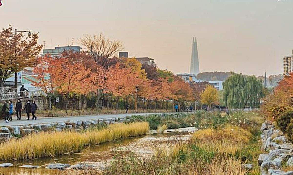 ソンネ川は、晩秋の絶景を堪能できるスポットです。広がる青空と紅葉、そして川面に映る夕焼けが織りなす風景は圧巻です。ソンネ川沿いの紅葉道は、ジャムヒョン小学校の裏手からソウルオリンピックパークテル前までの1km区間で、短いながらも、桜並木が作り出す紅葉のトンネルや、ススキ・葦の風情が調和し、晩秋まで楽しむことができます。この区間を過ぎて川沿いを進むと、松坡区内の漢江の夕焼けスポットにたどり着きます。オリンピック大橋と、その上に沈む夕日・夕焼け、そして川面に映る景色は、息をのむほどの美しさです。川のせせらぎ、鳥のさえずり、紅葉の葉が風に揺れる音を聞きながら夕焼けを眺めると、秋の情緒が存分に味わえます。