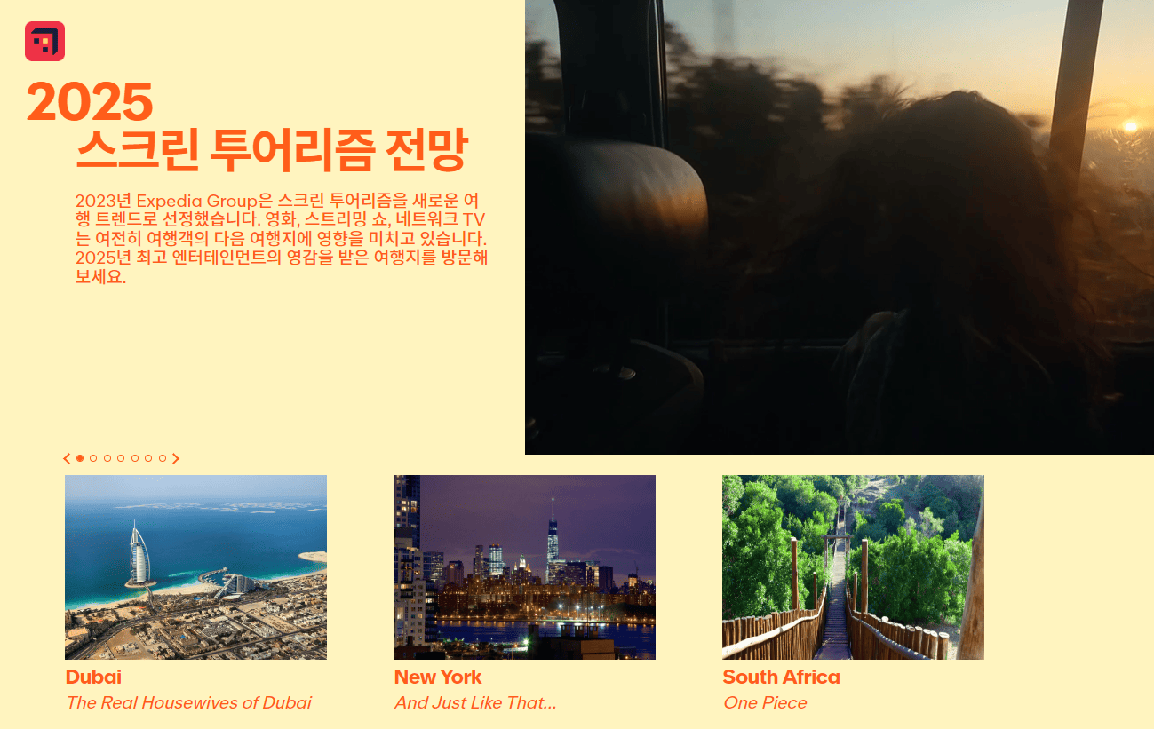 第六のトレンドは「2025年スクリーンツーリズム展望(2025 Set-Jetting Forecast)」で、ストリーミングやテレビ番組からインスピレーションを受けた旅行が注目されています。2022年にスクリーンツーリズムを旅行トレンドとして定義して以来、この分野は持続的な成長を遂げています。
