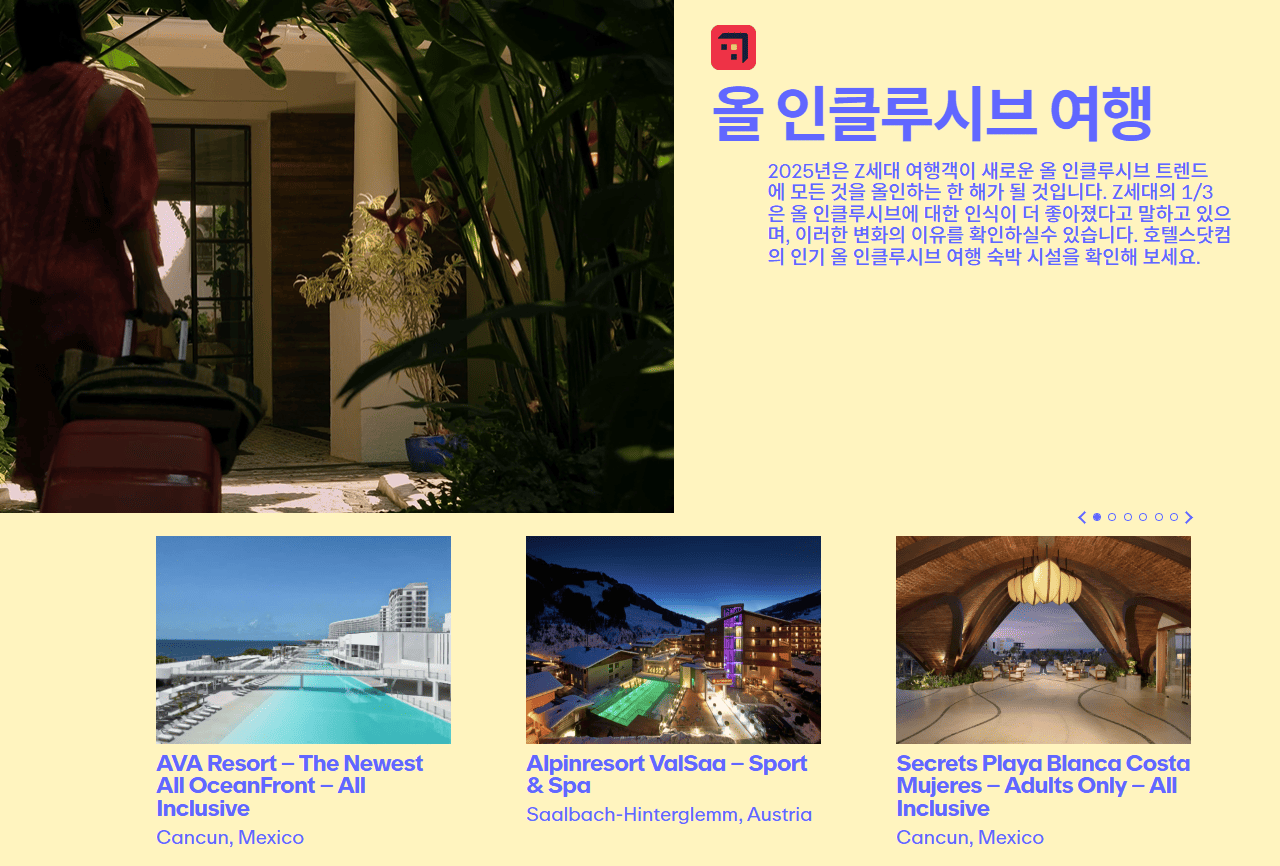 同社が提示した第一の旅行トレンドは「オールインクルーシブ旅行(All-Inclusive Era)」です。Z世代の旅行者が、宿泊、食事、飲料、アクティビティを一括で楽しめるオールインクルーシブリゾートに高い関心を寄せていることが明らかになりました。2025年には、大手ホテルブランドがオールインクルーシブ市場に本格参入し、従来のビュッフェや基本サービスを超える多彩なサービスが提供されることで、ラグジュアリーの概念が再定義されると予測されています。