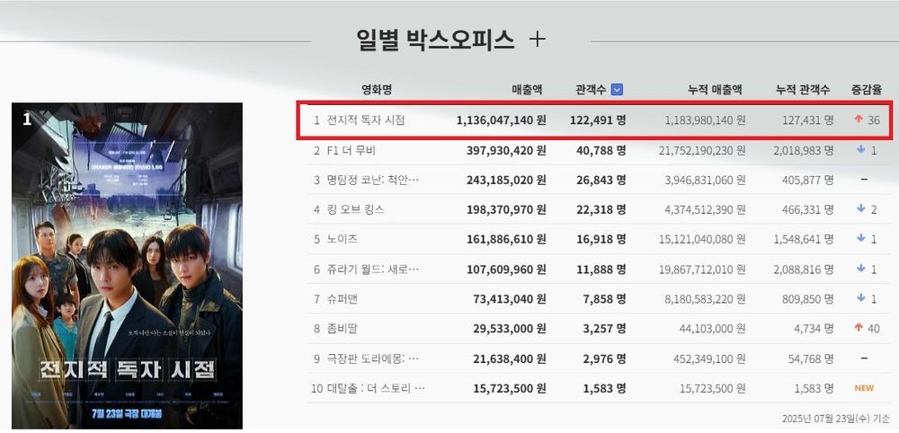 24日、映画館入場券統合電算網によると、前日に映画『全知的読者視点』(以下『全読視』)がブラッド・ピット主演の『F1 ザ・ムービー』を抑え、ボックスオフィス第1位に躍り出た。公開前から予約率1位という期待を集めていた『全読視』は、公開初日に10万人を超える観客動員という快挙を成し遂げた。