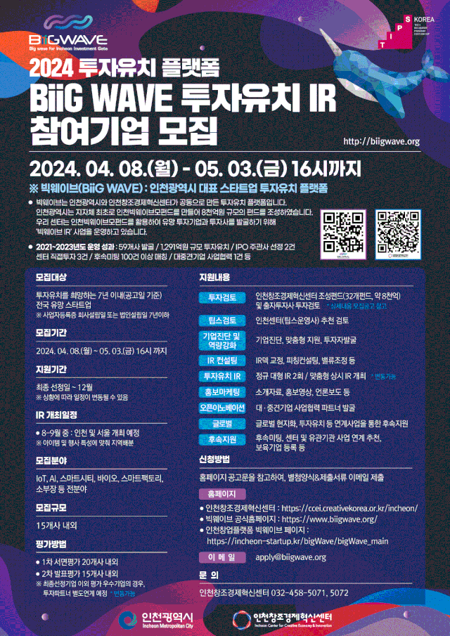 Park Kyung-soo, Head of the Startup Venture Division, said, “BiiG WAVE has become a stepping stone for excellent startups to grow based in Incheon, achieving an average competition rate of 20:1 and an investment attraction performance of 48.1 billion won ($40.8 million) in 2023,” and added, “We will actively support the activation of Incheon’s startup investment ecosystem, such as expanding fund creation, not only for BiiG WAVE.”